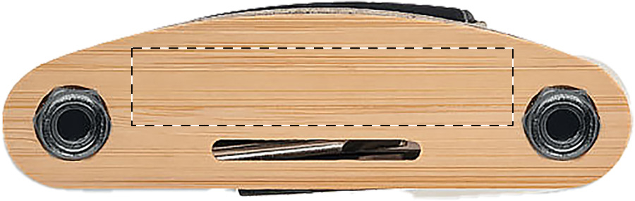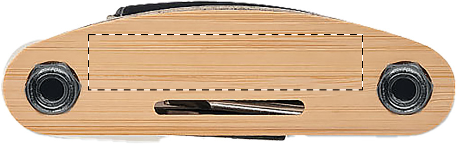 Multitool aus Edelstahl mit Bambusgriff und 14 Funktionen. Enthält Schlitz- und Kreuzschlitzschraubendreher, 5 Inbusschlüssel, 3 Inbuseinsätze mit Verlängerungsstange und 4 Gabelschlüssel.